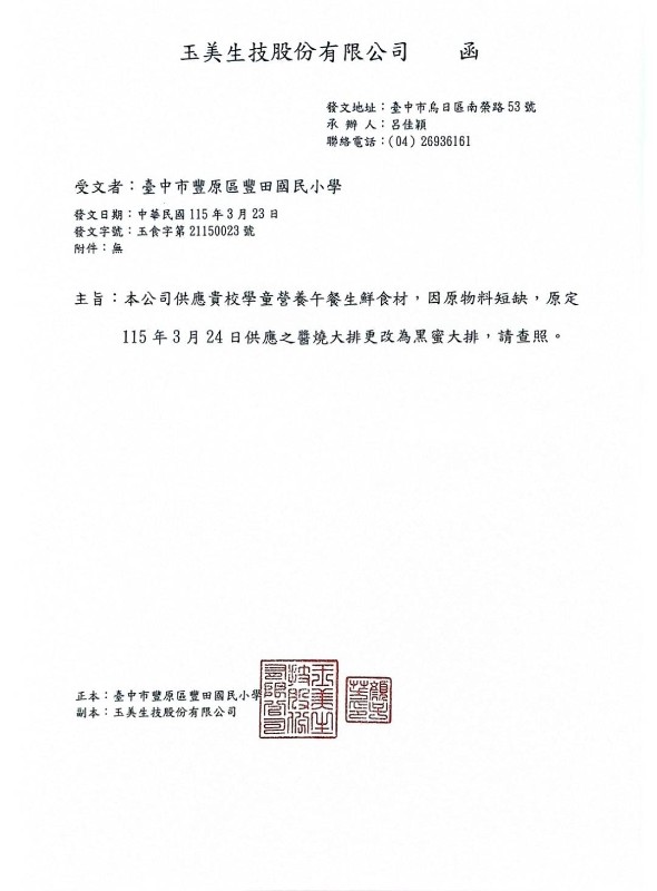 供應醬燒大排,因廠商物料短缺,故改供應黑蜜大排。