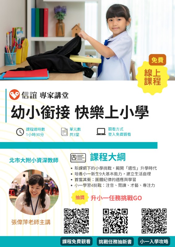 為幫助今年即將升小一的孩子順利銜接小學生活,信誼基金會提供線上課程「做好幼小銜接 快樂上小學」讓新生家長免費觀看,由北市大附小資深教師張偉萍主講,透過3堂課程帶爸媽認識小學世界,陪伴孩子上小學。三堂課主題如下: |