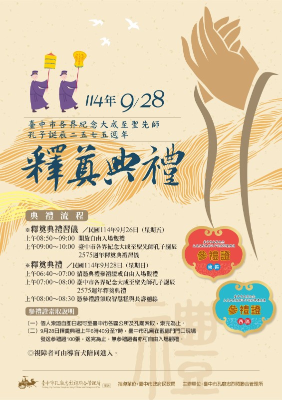 說明: 一、依據本府民政局114年9月9日中市民宗字第1140024187號函辦理。二、旨揭典禮訂於114年9月28日(星期日)上午7時假本市孔廟(北區雙十路二段30號)舉行,參禮人員請於當天上午6時50分前抵達,並配戴參禮證依指定位置觀禮。三、有關參禮證之索取,請於114年9月26日(星期五)前依需求數量至本局終身教育科索取(請務必配戴學校識別證);另因參禮證數量有限,索取前可先行來電洽詢本局承辦人(22289111分機54525)。四、檢附海報1份。