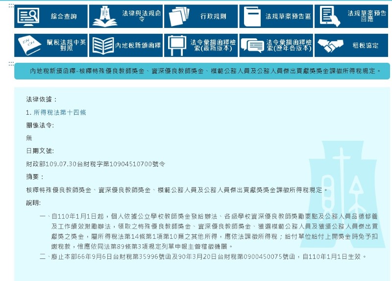 | 標題 | 領取資深優良教師獎金應依法課徵所得稅 |