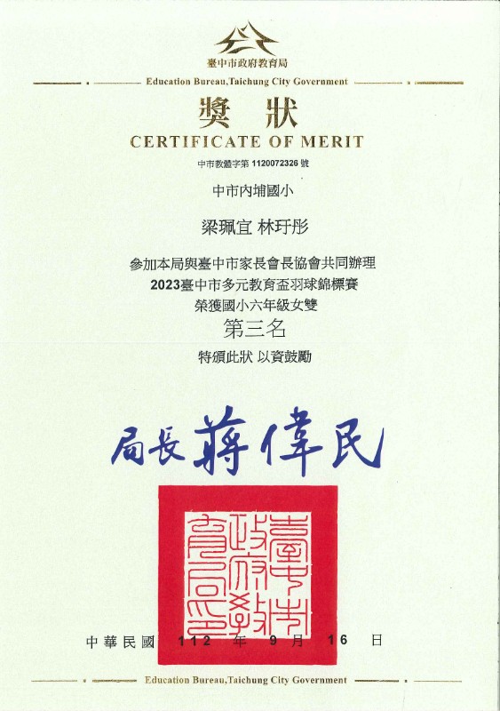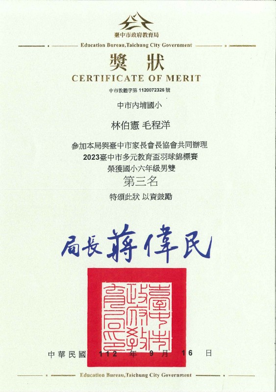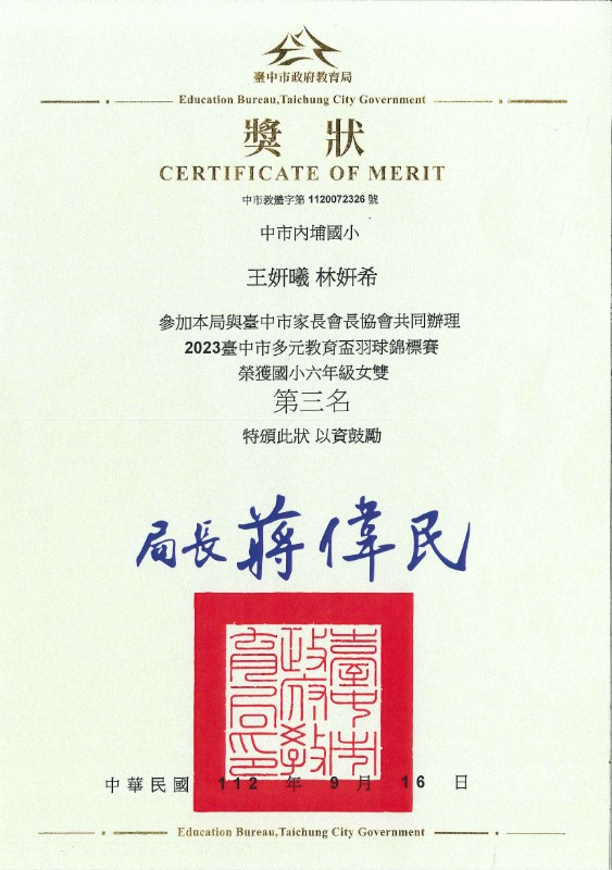 ★ 2023臺中市多元教育盃羽球錦標賽 國小六年級男雙 第三名 林秉邑 劉欣旻 國小六年級男雙 第三名 林伯憲 毛程洋 國小六年級女雙 第三名 王妍曦 林妍希 國小六年級女雙 第三名 梁珮宜 林玗彤