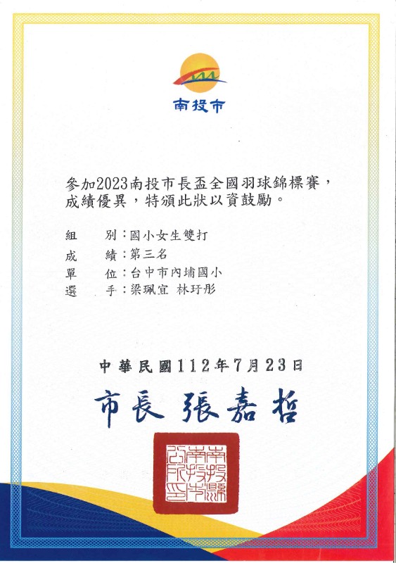 恭喜羽球隊員參加以下比賽獲得佳績: ★ 2023南投市長盃全國羽球錦標賽 國小女生雙打 第三名 梁珮宜 林玗彤