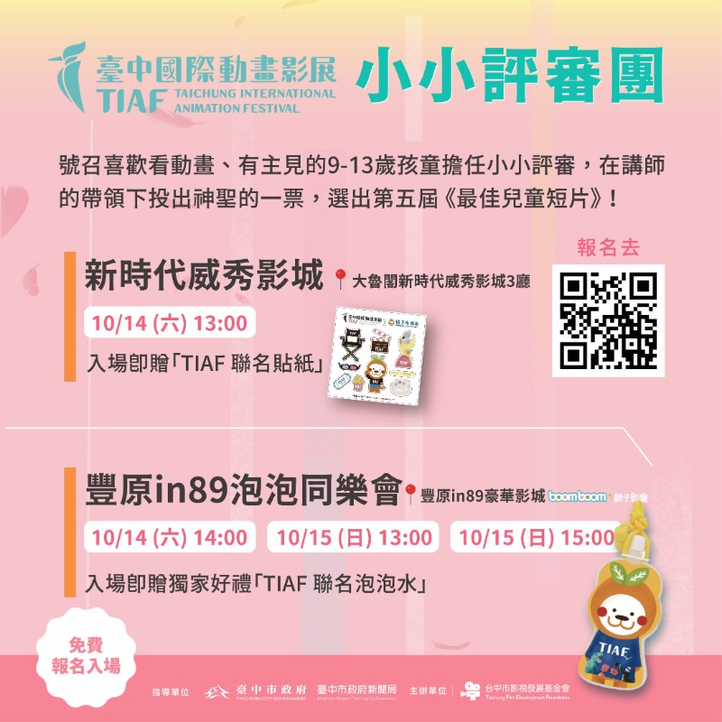 檢附旨揭影展活動海報、選片指南暨戶外放映活動場圖卡、小小評審團圖卡電子檔,惠請協助張貼(更多活動內容,請詳參影展官網https://twtiaf.com/2023/;粉絲專頁https://www.facebook.com/tiaf.taichung;主視覺形象廣告https://www.youtube.com/@tiaf8829)。 |