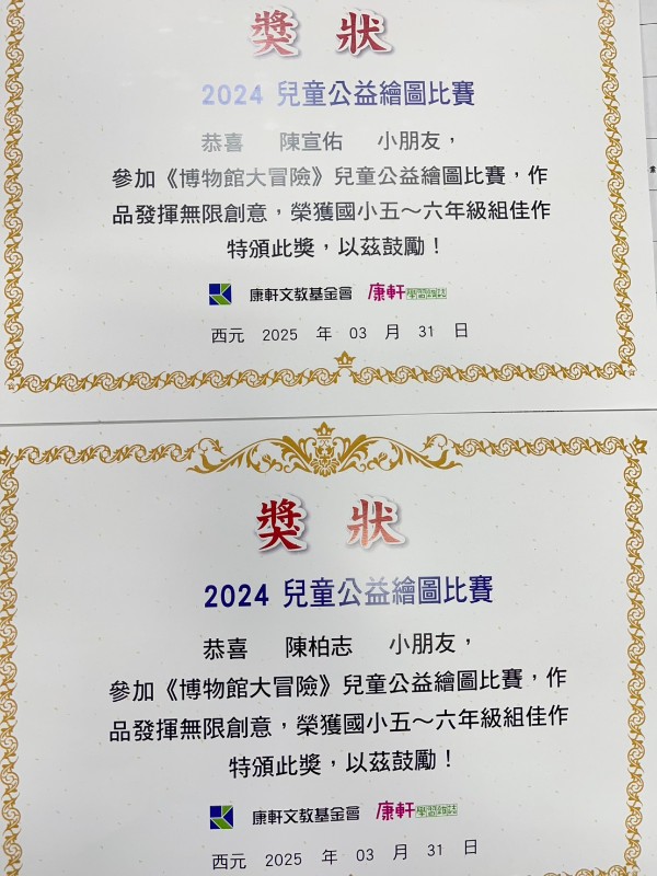 恭喜606陳宣佑、503陳柏志獲得2024兒童公益繪圖比賽佳作