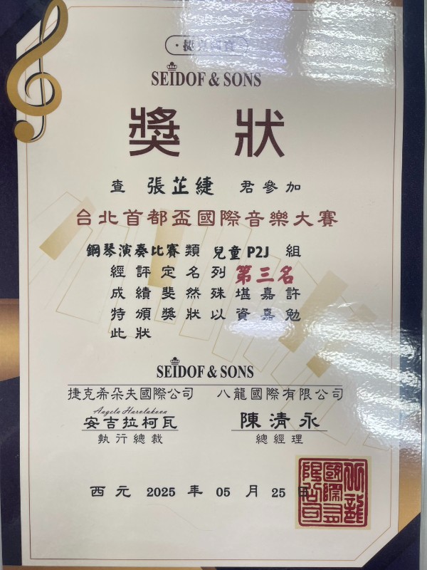 賀!408張芷緁參加台北首都盃國際音樂大賽獲得鋼琴演奏比賽類 兒童P2J組第三名