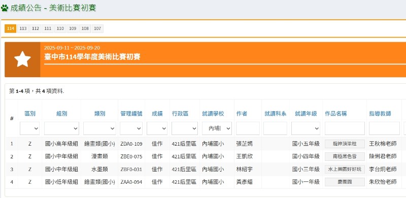 恭喜以下同學參加114學年度全國學生美術比賽臺中市初賽榮獲佳作 501張芷嫣 獲 高年級組 繪畫類 佳作 408王凱欣 獲 中年級組 漫畫類 佳作 309林紹宇 獲 中年級組 水墨類 佳作 103黃彥縉 獲 低年級組 繪畫類 佳作