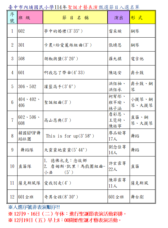 | 臺中市內埔國民小學114年聖誕才藝表演甄選節目入選名單 |