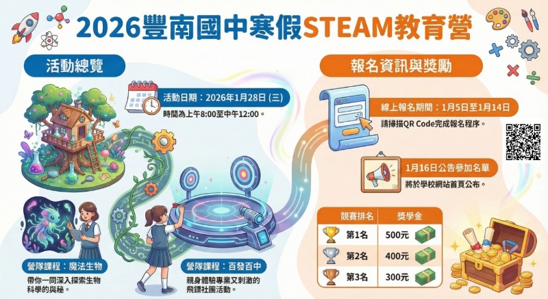 主旨:本校辦理115年度國小六年級寒假營隊活動,敬請協助宣導並鼓勵學生報名參加,請查照。說明:一、本校結合新課綱自然領域課程,發展科學觀察力結合學科領域的體驗與學習,培養學生對自然的應用能力與素養,建立邏輯思考能力。二、旨揭課程資訊說明如下:(一)課程時間:115年1月28日(三),上午8時至12時。(二)課程地點:豐南國中生物實驗室/飛鏢教室。(三)課程人數:STEAM教育營(二課程擇一報名,計60名)。(四)課程費用:免費。(五)報名方式:網路報名(https://docs.google.com/forms/d/1WkPGtlxsJ8kxrhdSbgoLM9gS_r5mY2qIAxLmuzyfbLw/edit)(六)報名時間:即日起至115年1月14日(三)止。三、聯絡人:本校教務處劉主任(04-25280185#111)。