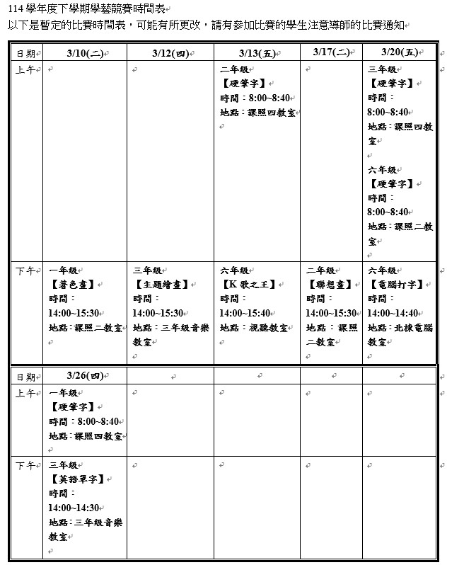 公告114學年度第二學期校內學藝競賽時間表(1236年級)