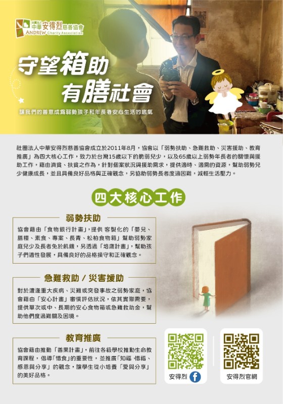 社團法人中華安得烈慈善協會成立於2011年8月,主要以「食物銀行」計畫,每月配送乙箱食物箱的方式,幫助15歲(含)以下的弱勢家庭學子,獲得所需營養之主副食品。 |
