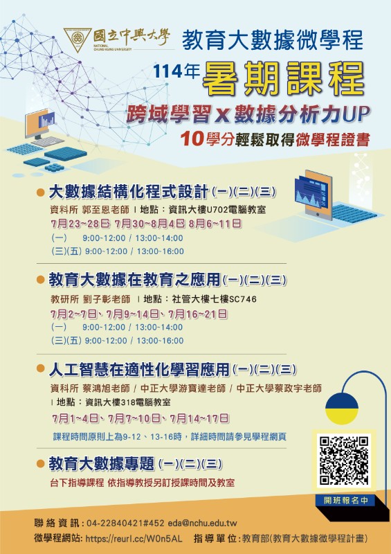 國立中興大學於114年7至8月開設「教育大數據微學程」暑期課程共4門,敬邀貴校教職員踴躍修讀,請查照轉知。 說明: 一、 課程簡介:本微學程課程聚焦於大數據資料庫介紹與數據資料分析工具,同時輔以教育統計分析方法,增進存取教育公開資料的能力,進而應用於解決教育現場問題,培養前瞻思維分析教育產業趨勢。修畢10學分且符合學程規定,即可取得微學程證書。 二、 上課時間(每堂課3學分,共48小時選修課程,確切時間詳見附件海報與課程網址) (一) 人工智慧在適性化學習應用(一)(二)(三) 上課日期區間:7月01日~7月17日。 (二) 大數據結構化程式設計(一)(二)(三) 上課日期區間:7月23日~8月11日 (三) 教育大數據在教育之應用(一)(二)(三) 上課日期區間:7月02日~7月21日 (四) 教育大數據專題a (一)(二)(三)台下指導課程,依指導教授另訂授課時間及教室,選課請先與指導教授(師資:https://reurl.cc/NYW1j9)聯繫,經教授同意後再選課。 三、 選課方式:即日起至6月23日(一)至報名表單報名,額滿為止(https://reurl.cc/nm3d7l )。興大學生免收費,成績登錄於114學年度第一學期;校外人士可依隨班附讀的方式修習課程,其他課程資訊詳見附件海報及微學程網站(https://reurl.cc/XA8YZa)。