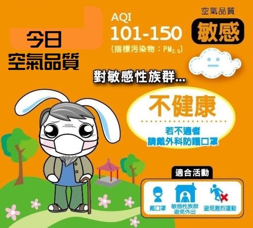 依據環保署空氣品質指標(AQI)對健康影響與活動建議,當AQI指標達橘色等級時,對敏感族群不健康。 (1)一般學生仍可進行戶外活動,宜減少長時間劇烈運動。 (2)敏感性族群之師生,宜減少體力消耗活動及戶外活動,必要外出應配戴口罩。