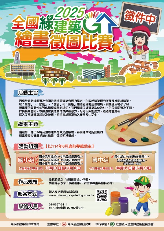 本所本(114)年度辦理「2025全國綠建築繪畫徵圖比賽」,敬請鼓勵貴校學生踴躍報名參加,請查照。 |