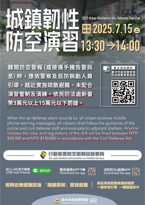 城鎮韌性防空演習 一、臺中市2025城鎮韌性(防空)演習訂於7月15日(星期二)13時30分至14時,採有預警方式,實施30分鐘警報傳遞與發放、疏散避難及交通管制等實作演練。 三、如何尋找附近防空避難處所?住家或辦公室大樓建築物貼有防空避難標誌牌示(水滴型避難人形 Icon)之地下室均可實施避難。另亦可運用手機下載「警政服務APP」及運用「消防防災e點通」或「警察局 LINE 官方帳號 ID:@tcpb 防空避難查詢系統)」導航查詢就近避難。 四、附件內政部「防空避難指引」、「民眾聽聞演習警報或接獲手機告警訊息問答 Q&A」。