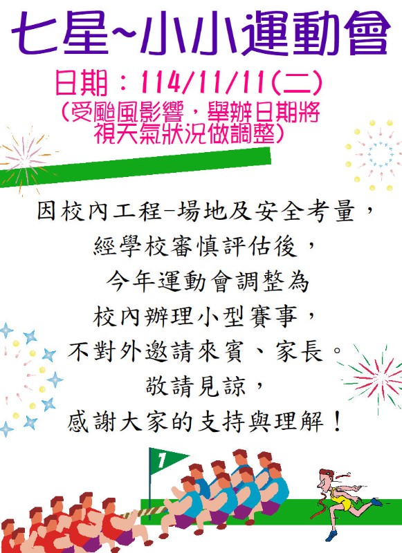 因校內工程-場地及安全考量, 經學校審慎評估後, 今年運動會調整為 校內辦理小型賽事, 不對外邀請來賓、家長。 敬請見諒, 感謝大家的支持與理解!