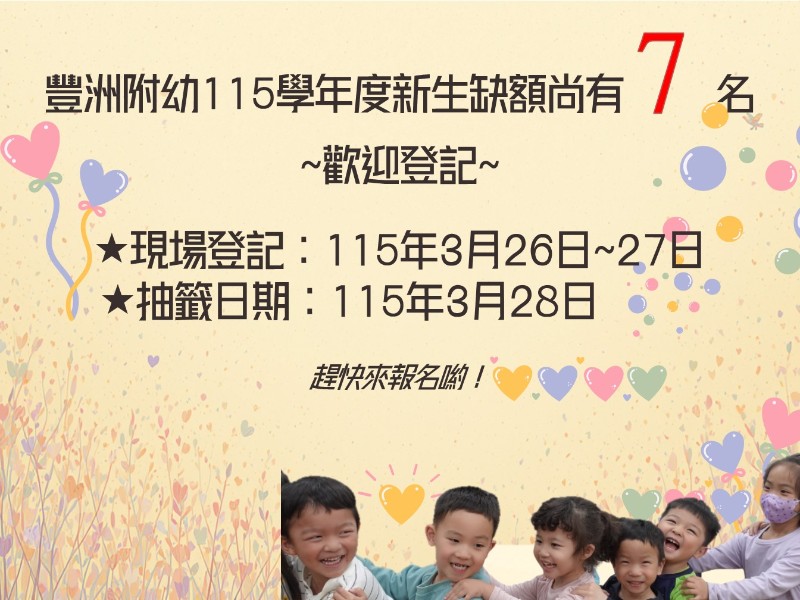 二、第三階段招生登記說明如下,歡迎年滿3足歲幼兒報名: (一)報名方式:採現場登記 (二)登記時間:115年3月26日(四)-115年3月27日(五),每日9-15點止 (三)登記地點:本校幼兒園 (四)預計缺額:7名。 (五)抽籤日期:115年3月28日(六)上午9點。 (六)其他事項請參閱第三階段招生簡章。