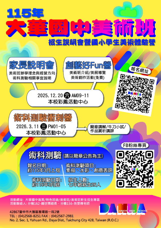 轉知大華國中「115學年度藝術才能美術班招生說明會暨國小學生創藝好Fun營」宣導DM1份