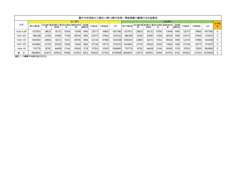 公告本校114學年度第一學期午餐專戶結餘款為25303元整。