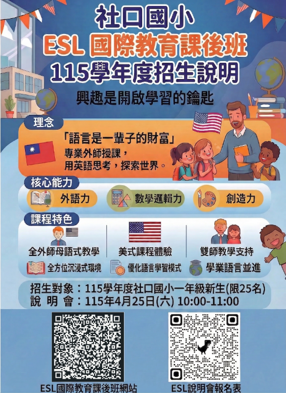 本校一年級新生ESL國際教育課後班115學年度招生說明會於0425辦理,歡迎新生家長參加!!