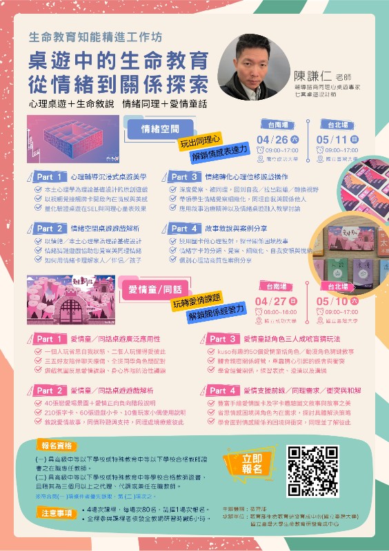 本研習規劃辦理4場次,詳細內容請參閱附件簡章及海報。(一)研習時間:114年4月26日(星期六)、4月27日(星期日)、5月10日(星期六)、5月11日(星期日)。(二)研習地點:臺北場-本校、臺南場-成功大學。(三)研習費用:全免,交通請自理。(四)參與對象:各公私立高中高職及國中小教師。(五)參與人數:各場次80人,額滿為止。(六)官網報名:https://reurl.cc/aeG0gl。