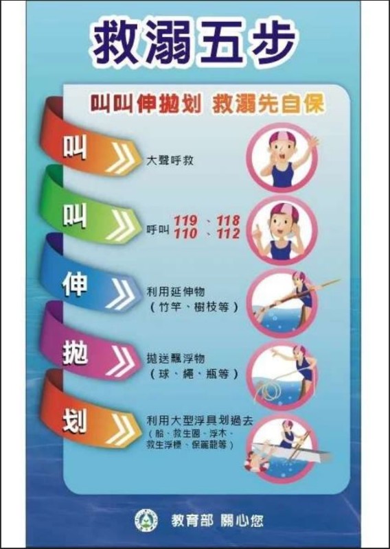 檢附救溺五步及防溺十招宣導文宣各1份供參,另相關防溺資訊可至教育部學生水域運動安全網(https://watersafety.sa.gov.tw/)查詢。 |