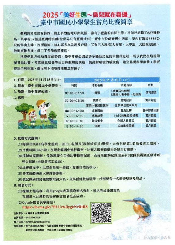 社團法人台灣野鳥協會辦理2025「美好生態-鳥兒就在 身邊」臺中市國民小學學生賞鳥比賽 |