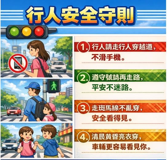 為加強學生及民眾交通安全意識,請大家提醒大家! 1、行人請走行人穿越道,不滑手機。 2、遵守號誌再走路,平安不迷路。 3、走斑馬線不亂穿,安全看得見。 4、清晨黃昏亮衣穿,車輛更容易看見你。