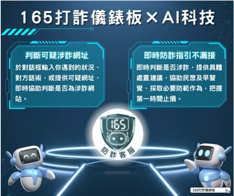 為強化社會大眾防詐知能及宣導檢察官於國民法官制度中協助被害人等職權,市府積極進行宣導。 因應詐騙手法快速演變,內政部警政署於「165打詐儀錶板」導入AI智能客服小幫手,整合防詐資料庫提供即時互動諮詢,可依民眾描述情境辨識詐騙風險並提供具體處置建議;另具備涉詐網址即時查詢功能,可判斷網站是否具詐騙風險。