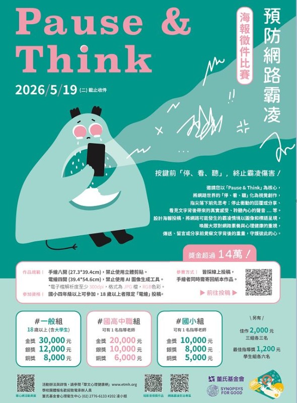 【Pause & Think】停止網路霸凌海報徵件比賽,即日起開始收件至民國115年5月19日止,邀請學生與老師以手繪或電繪方式創作海報投稿,得獎作品可獲獎金,國小組金獎一萬元、國高中職組金獎兩萬元、一般組金獎三萬元…等,共30個獎項,總獎金超過14萬元。 活動辦法請參閱https://reurl.cc/lpRGLE 。 ★學校團報專案,國小組與國高中職組增設「最佳響應獎」,投稿作品數最多的學校可獲得實用3C用品!