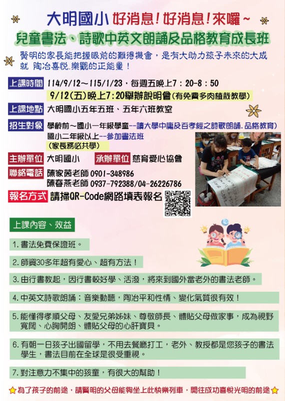 慈育兒童書法、詩歌朗誦及品格教育成長班報名事項如下: