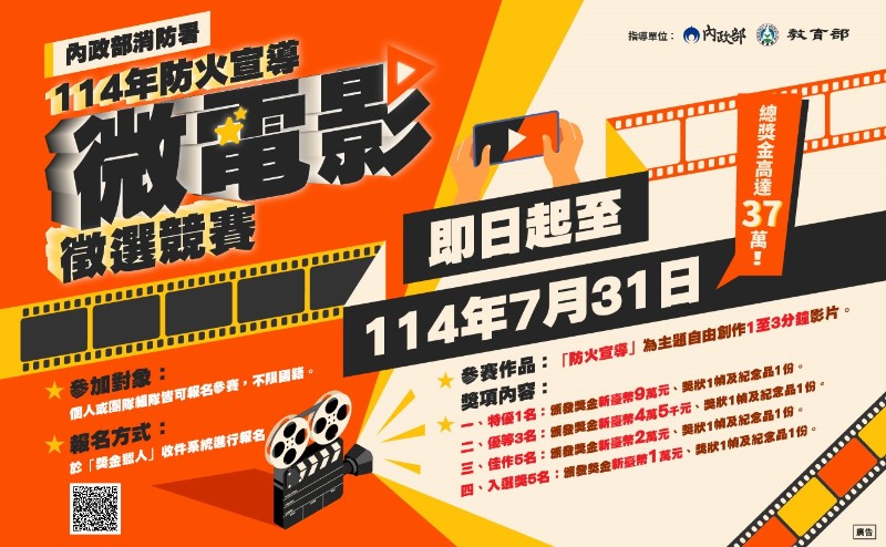 內政部消防署「114年防火宣導微電影徵選競賽活動」歡迎踴躍參加