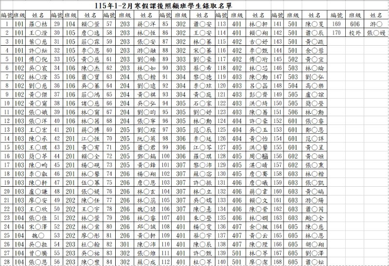 115年寒假課後照顧班上課日期為115/1/26-115/2/13,錄取名單如下,課照班教師會於115/1/14(三)-115/1/21(三)通知家長寒假課照上課地點。