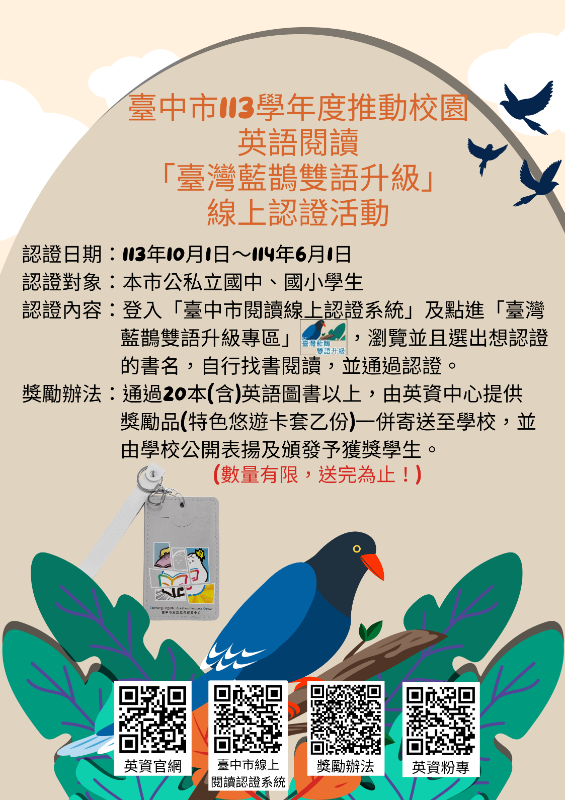 113學年度推動校園英語閱讀「臺灣藍鵲雙語升級」線上認證活動獎勵辦法