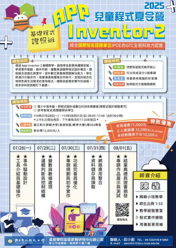 | 標題 | 【活動】國立彰化師範大學進修學院推廣教育「【2025兒童程式夏令營】Minecraft 指令大師」、「【2025兒童程式夏令營】App Inventor 2 基礎程式證照班」 |