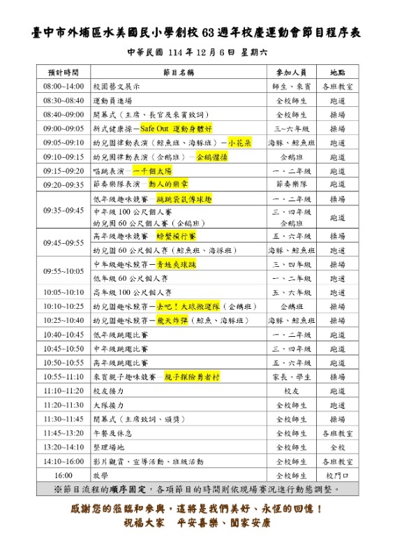 臺中市外埔區水美國民小學創校63週年校慶運動會 時間:114年12月6日 星期六 邀您一同共襄盛舉,我們不見不散! |