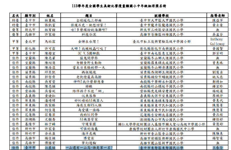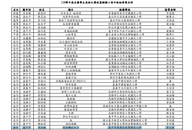 | 標題 | 全國學生美術比賽決賽得獎名單 |