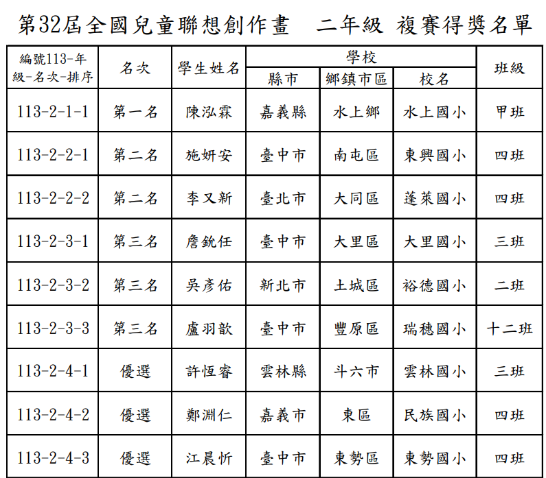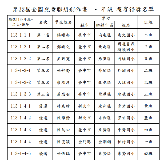 104班 陳韵心同學 榮獲 第32屆全國兒童聯想創作畫比賽一年級組優等104班 張恆瑀同學 榮獲 第32屆全國兒童聯想創作畫比賽一年級組優等204班 江晨忻同學 榮獲 第32屆全國兒童聯想創作畫比賽二年級組優等感謝陳惠琳老師及李佳琪老師細心指導並給予鼓勵,在全國海選初賽後,決賽能勇奪佳績,非常棒。