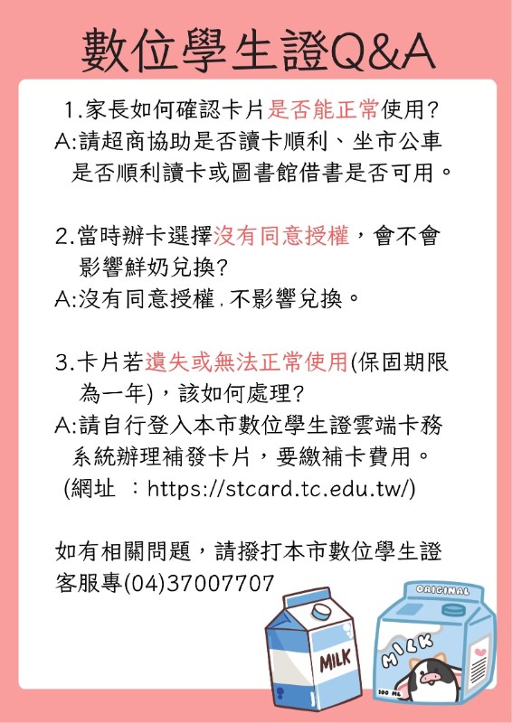 親愛的家長您好: 為配合臺中市政府數位學生證結合「台中有鈣讚」鮮奶補助計畫,預計從114學年度第2學期開始實施,讓學童每週可持學生證至超商兌換1瓶鮮乳,會再公告。 請您確認孩子目前是否持有學生證、卡片是否可以正常使用,並回覆以下問卷,感謝您的配合! 數位學生證持有情形調查問卷 https://forms.gle/4XWza3DcG8FdCDh36 Q1 若卡片遺失?