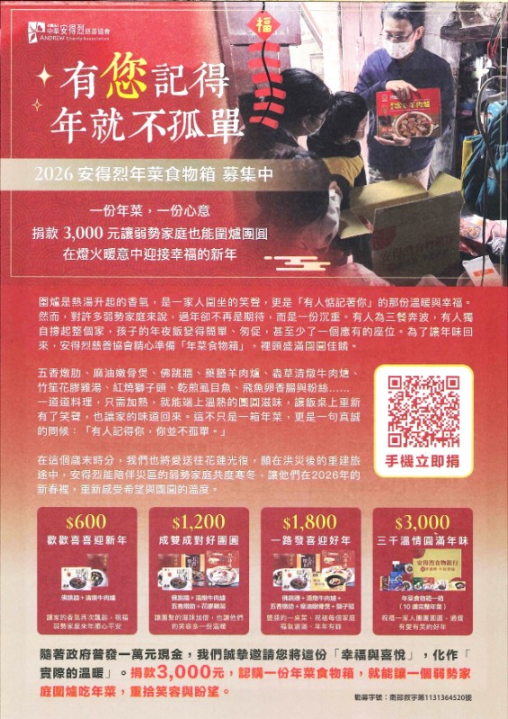 | 標題 | 活動轉知:【有你記得,年就不孤單】2026 安得烈年菜食物箱,募集中! |