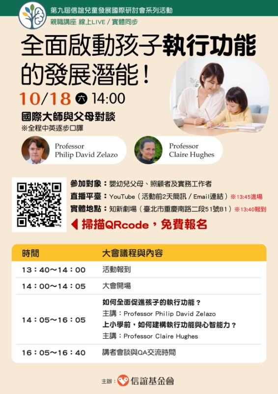 了解孩子的執行功能發展脈絡,就像握有一把開啟未來成長學習能力的鑰匙。第九屆信誼兒童發展國際研討會親職講座特別邀請長期投入幼兒執行功能研究國際權威學者Professor Philip David Zelazo及Professor Claire Hughes主講,全程中英逐步口譯,內容涵蓋執行功能的發展軌跡、影響面向及教養日常的培養與強化策略。 |