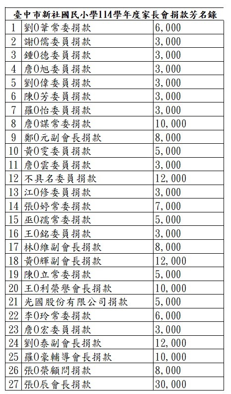 感謝家長會強力後盾支持!!114學年度家長會捐款徵信名冊(截至11/30)