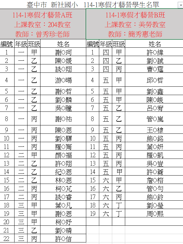 | 標題 | 114-1寒假才藝營報名繳費截止,參加學生名單如附件 |