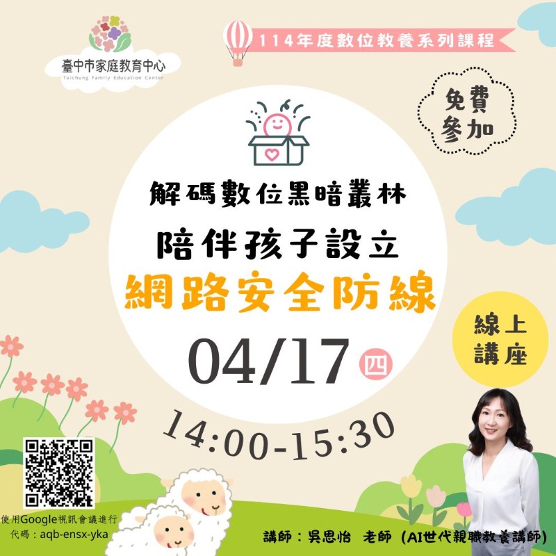 家庭教育中心舉辦114年「第二季親職教育」、「4月份好家在台中兒童節系列課程」及「5-6月份數位教養課程」