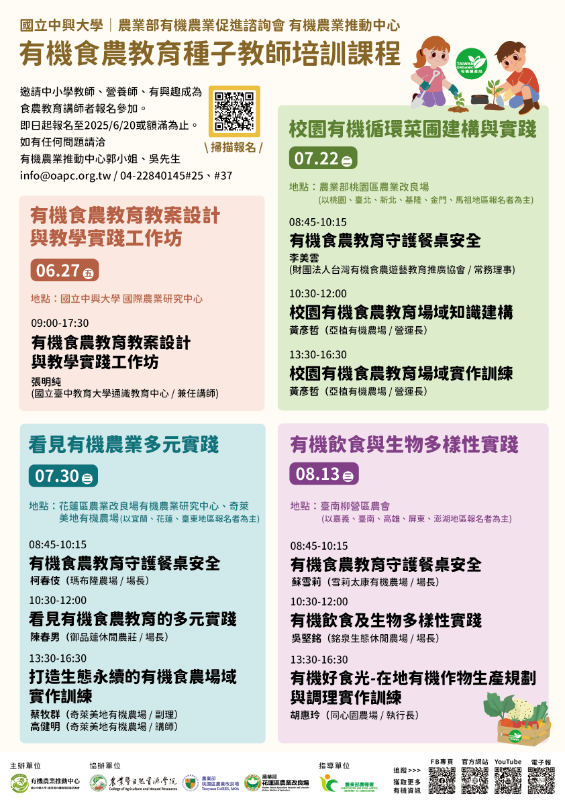 114年6月27日(星期五)09:00-18:00,有機食農教育教案設計與教學實踐工作坊:「有機X食農-打造有機食農教育關鍵字」、「有機食農教育教案設計與實踐案例分析」、「有機食農教育教案策略分析與應用實踐」,課程地點:國立中興大學國際農業研究中心。 |