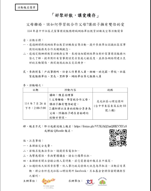 「114年度臺中市社區式家事商談服務」「好聚好散,讓愛續存」-因故改期至114年8月7日(星期四) |