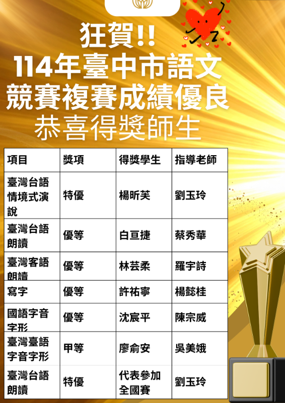狂賀!!恭喜參加114年臺中市語文競賽複賽師生榮獲佳績!