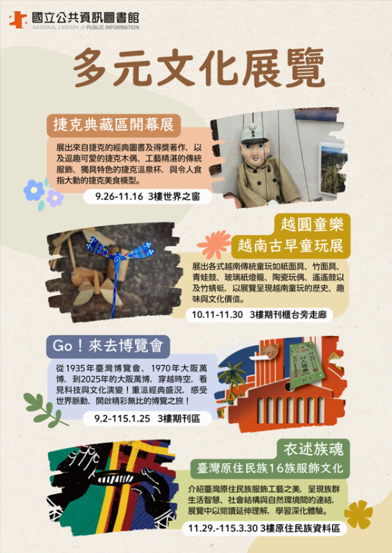 | 標題 | 轉知:國立公共資訊圖書館辦理多項展覽包含捷克、越南、博覽會及原住民族文化等資訊。 |