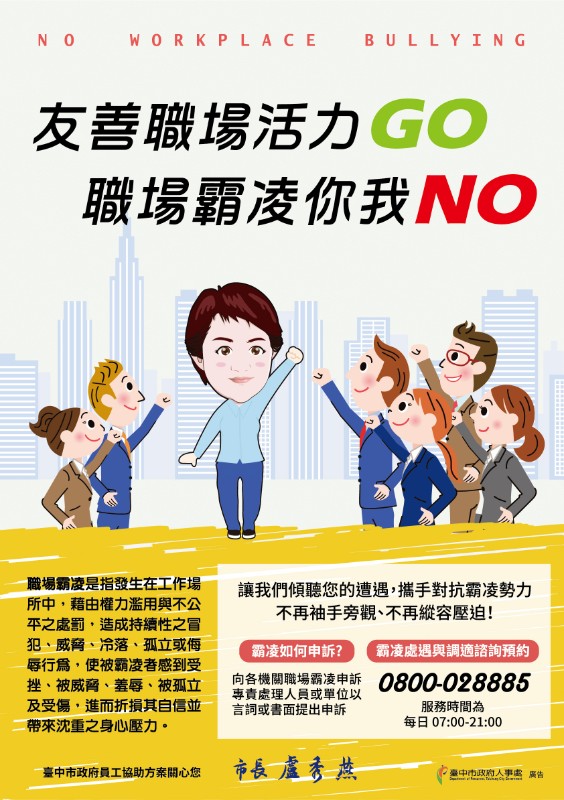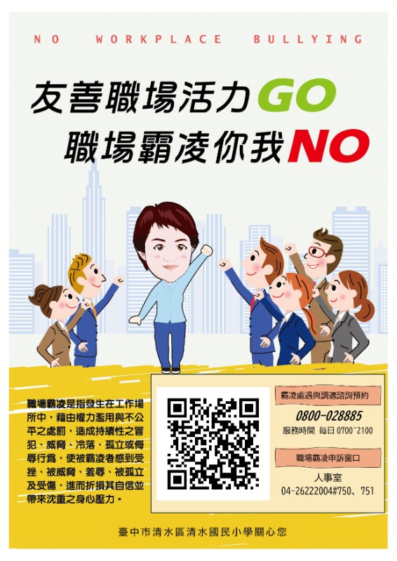 📢職場霸凌不僅影響個人身心,更可能破壞團隊信任與職場氛圍,學校對此零容忍,人事室呼籲,全體同仁應摒除先入為主或刻板印象的看法,於公務處理上應秉持就事論事原則,以誠意與善意進行溝通、化解歧見。與同事互動時,務必避免職場霸凌之情事,尤其主管人員更應自持分際,切勿濫用職權,發生權勢霸凌之不當行為。 📢同仁如有職場霸凌處遇與調適等諮詢需求,可利用臺中市政府員工協助方案「有問題來找我」免費協談專線0800-028-885(每日自上午7時至晚間9時由專人接聽),由專業人員傾聽您的遭遇,共同對抗職場霸凌。 本校霸凌申訴管道