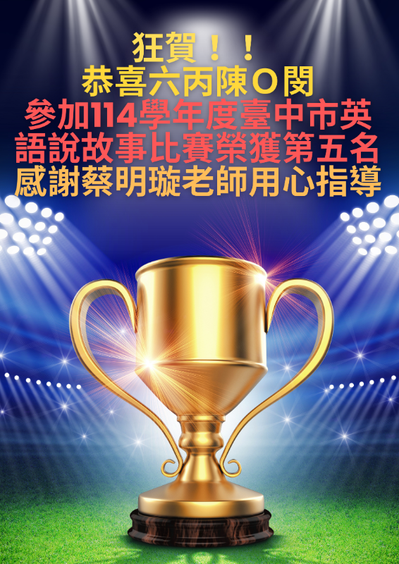 | 標題 | 賀!恭喜六丙陳O閔同學參加114學年度臺中市英語說故事比賽榮獲第五名,感謝蔡明璇老師指導 |
