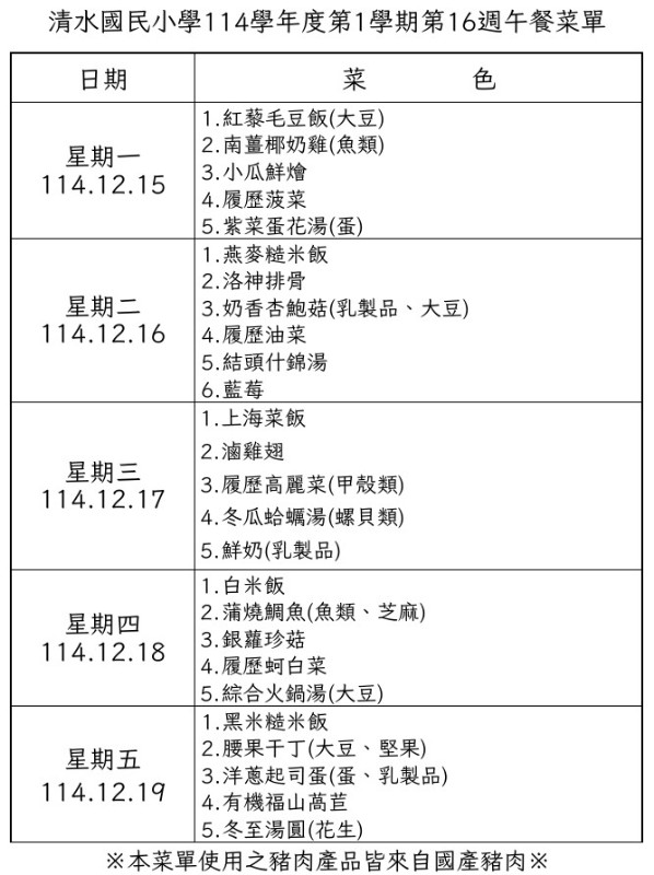清水國民小學114學年度第1學期第16週午餐菜單